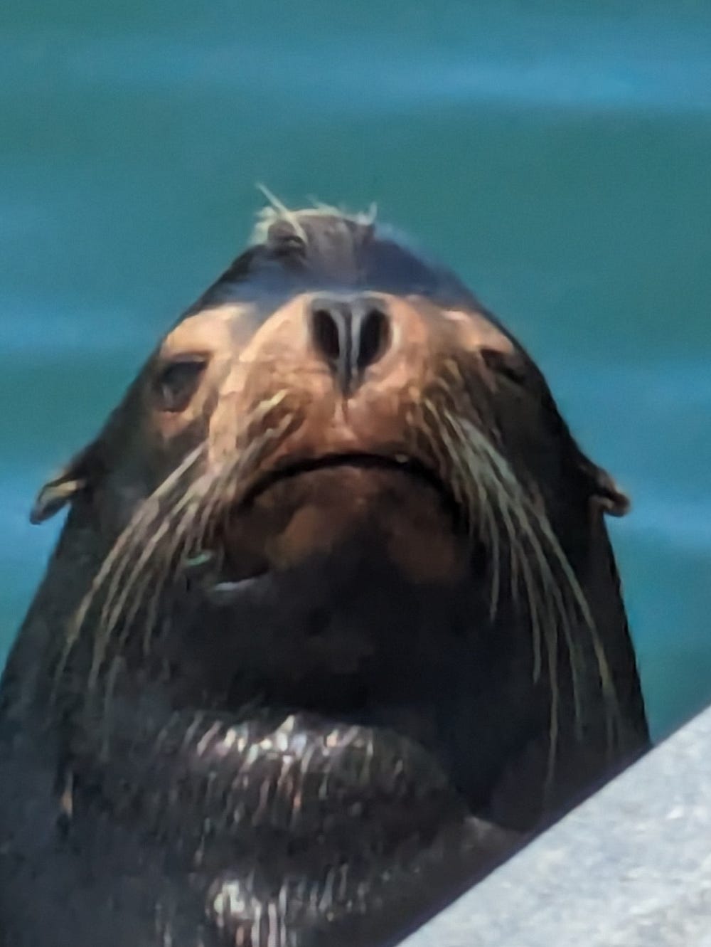 I stop along the way, usually at Bodega Bay, to say hello to the sea lions that often hang out there. This was a special day, as you can see in the photo above, when one of them came onto the ramp below where I was and checked me out, as I was checking him out. An intense connection that was sheer delight. What a way to start my trip!